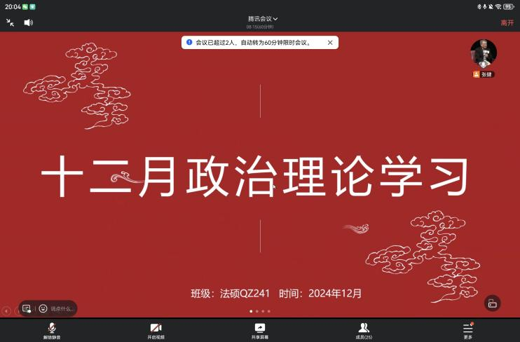 (通讯员 杨绚清)为深入学习贯彻习近平新时代中国特色社会主义思想,切实增强研究生群体的“四个意识”、坚定“四个自信”、做到“两个维护”,持续提升德赢ac米兰官方合作vwin研究生的政治理论素养与思想觉悟,深刻领会党的二十大精神的核心要义与实践要求,12月25日晚20:00,德赢ac米兰官方合作vwin研究生各班级以线上形式成功举办十二月政治理论学习班会。全体班级成员积极响应、踊跃参与,共同完成了一场内容充实、意义深远的理论学习之旅。