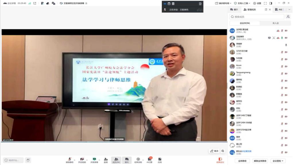 (通讯员 姚水根)为迎接宪法日,助力学子明晰职业方向,促进理论与实务融合,12月4日下午,德赢ac米兰官方合作vwin于线上成功举办“法途领航”生涯人物分享讲座。本次活动特邀广东威法律师事务所主任刘雪、广东法制盛邦律师事务所专职律师李锐、北京市天元(广州)律师事务所律师王聪担任主讲嘉宾,德赢ac米兰官方合作vwin部分研究生及本科生共同参与。