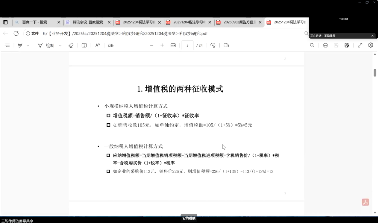 王聪以“税法学习与实务研究”为焦点,通过典型案例,揭示税法实务中的典型问题。他在诉讼领域分析了法院拍卖房产中的税费承担风险,在非诉领域则阐述了反避税规则的意义,并分享了通过合法商业设计优化税务安排的思路,助力同学们打通税法理论与实务应用的脉络。