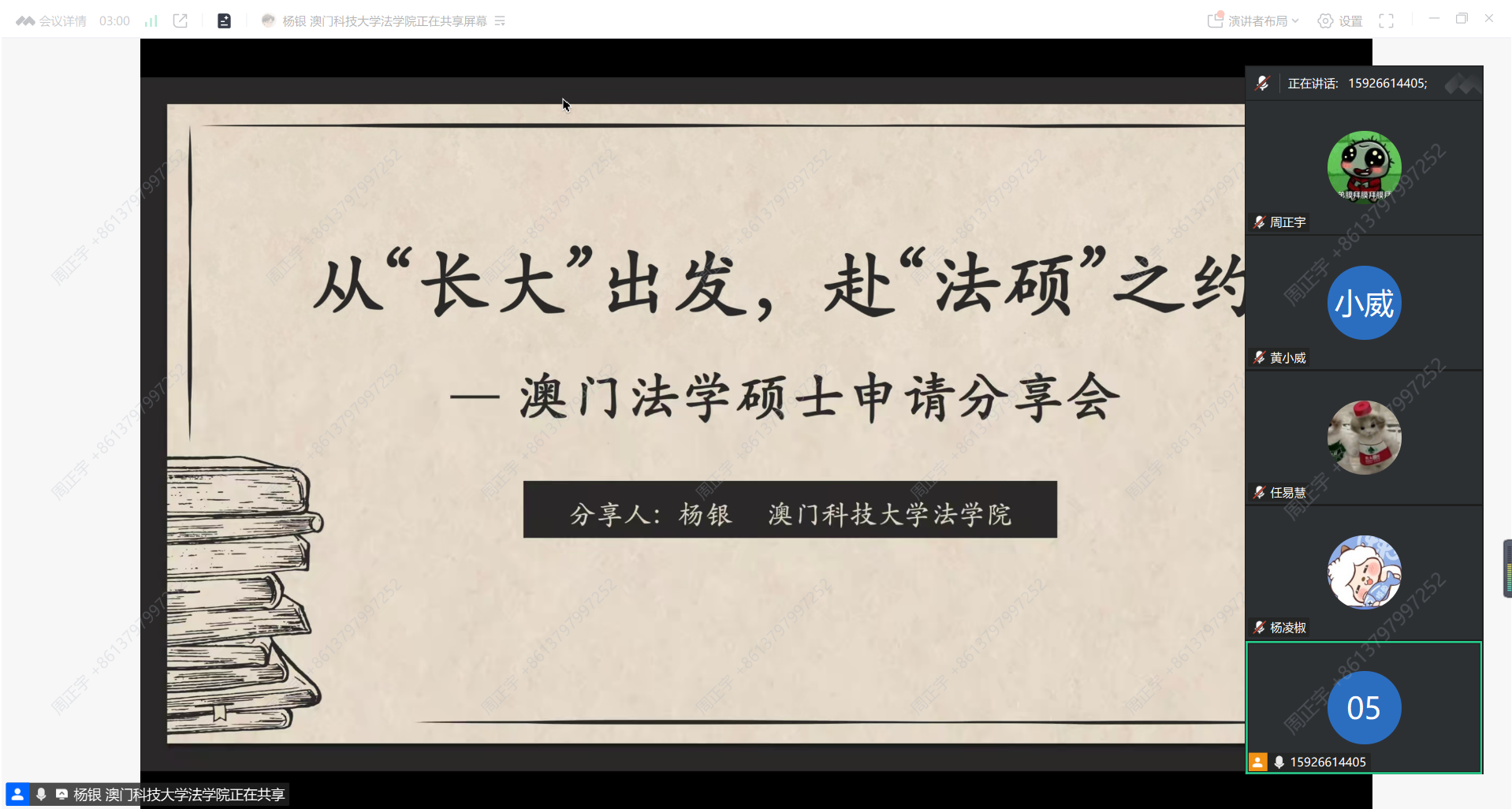 (通讯员 周正宇)为进一步拓宽我院学子升学渠道,助力学生把握发展机遇,德赢ac米兰官方合作vwin于2026年3月3日下午4时,通过腾讯会议线上举办2026年澳门法学硕士申请分享会。本次分享会特邀澳门科技大学杨银博士主讲,德赢ac米兰官方合作vwin院长李华成参会,辅导员雷礼主持,学院部分大三、大四学生参会。